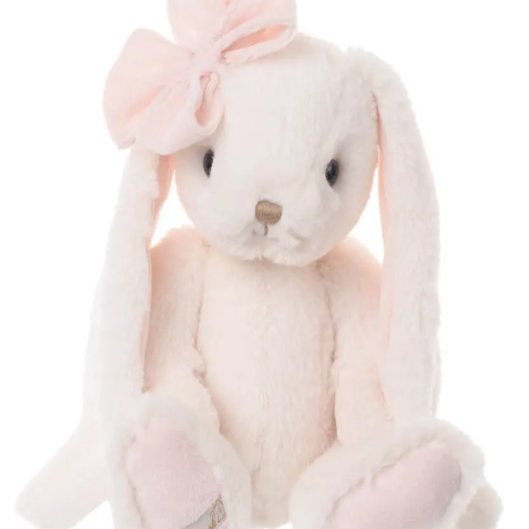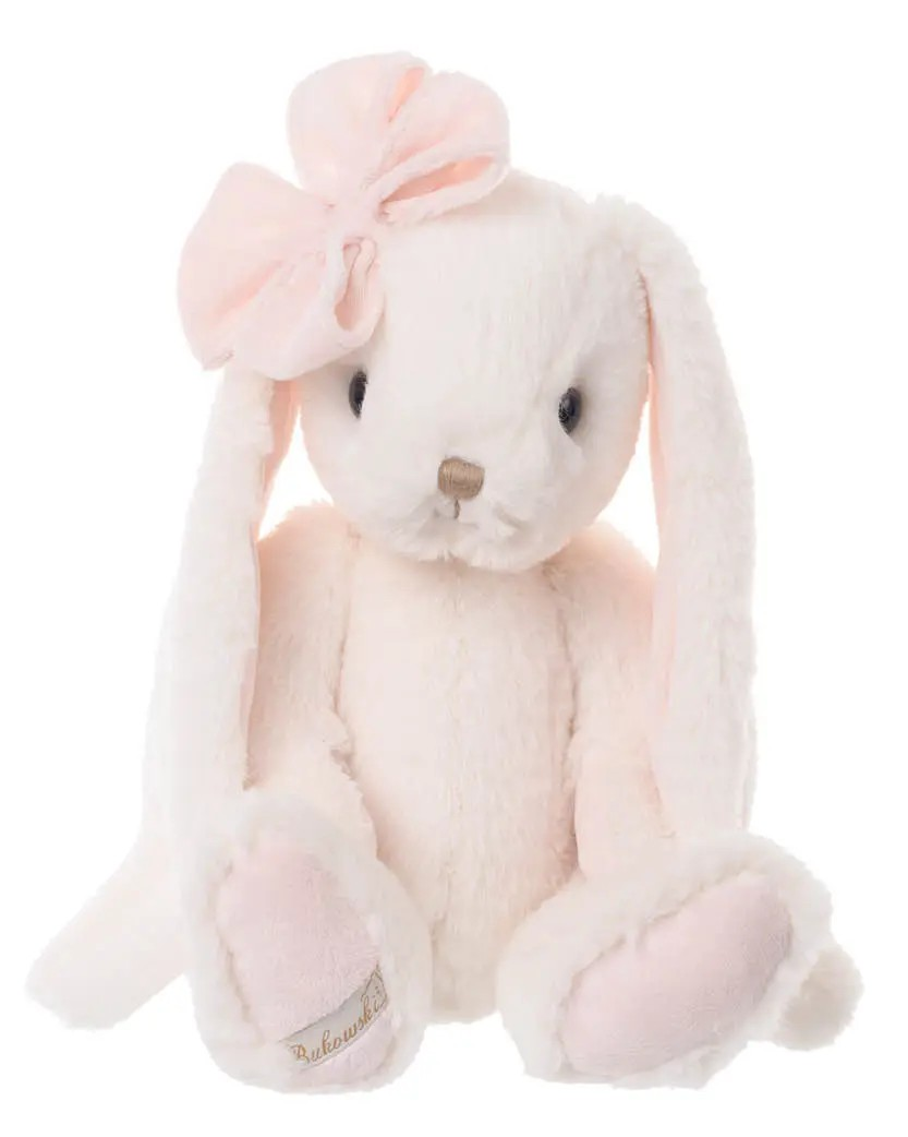 En kramgo kanin med långa öron och stor rosett