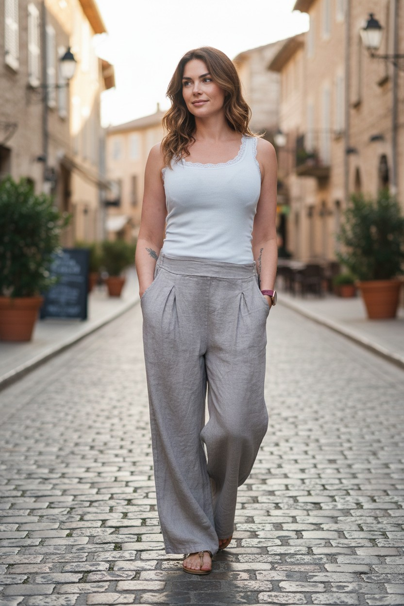 Snygga linnebyxor med linning fram och resår bak i midjan. Snedskurna fickor i sidorna.