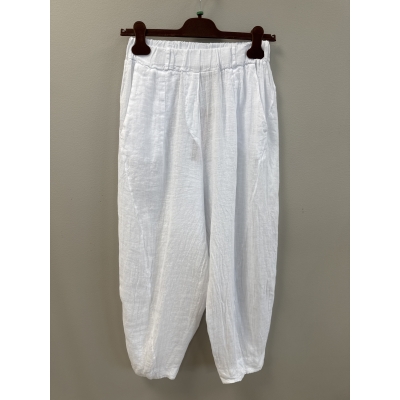 Sköna luftiga linnebyxor med resår i midjan och sidfickor. Avslappnad ballongmodell med avsmalnande ben nertill.
