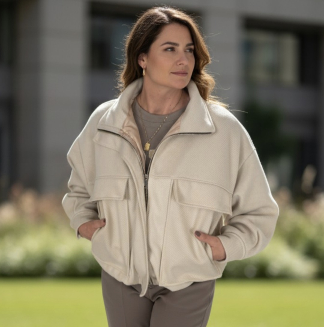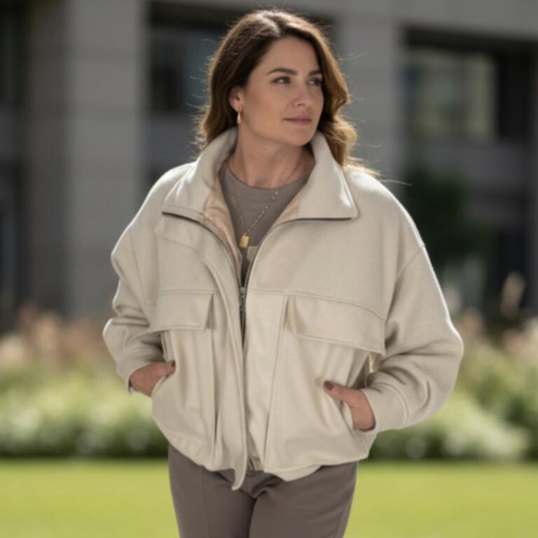 Fin jacka med hör hals, stängs med dragkedja, stora fickor med lock framtill, långa ärmar med knapp vid ärmslut
