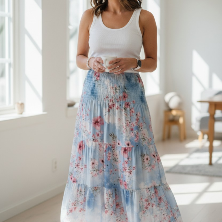 Fiin blommig kjol från Cosy House med stretchig smockresår i midjan.
