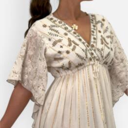 En fantastisk maxiklänning i en omtyckt modell. V-hals i omlott, prydd med brunt broderi samt med e...699 kr