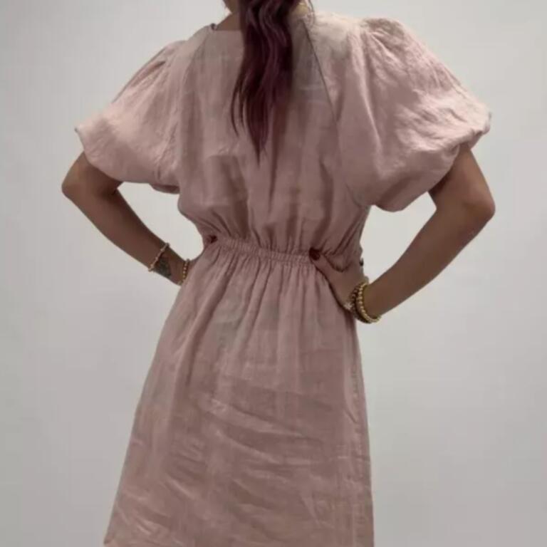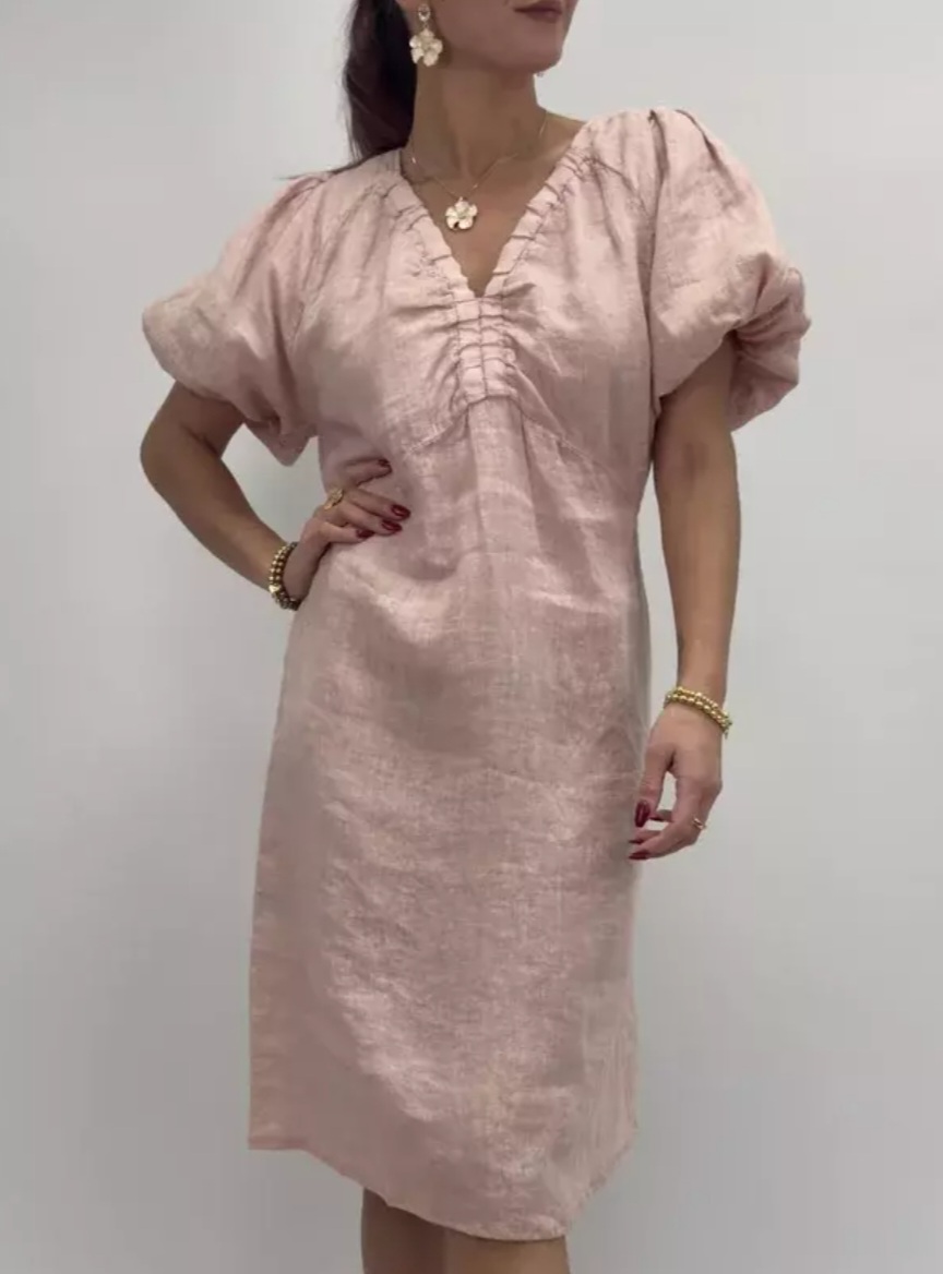 Luftig linneklänning med kort längd, v-ringning och korta ärmar. Rynkdetalj framtill och resår bak i ryggen.