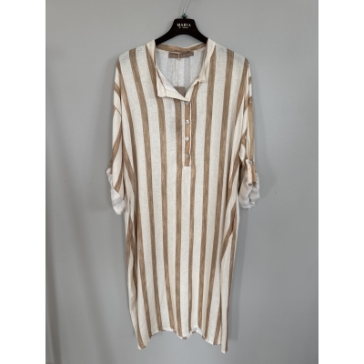 Den har vertikala ränder och en knäppning fram med en skjortkrage.
