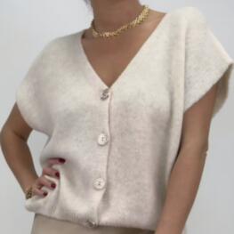 Sanna är en trendig stickad kofta med v-ringning, korta ärmar och dekorativa gulknappar. Den avsla...499 kr