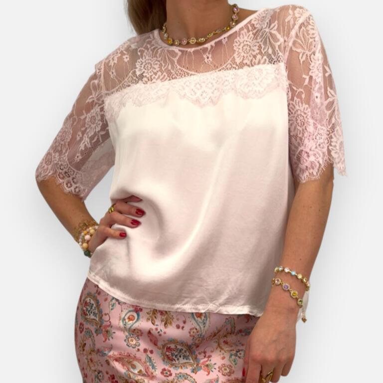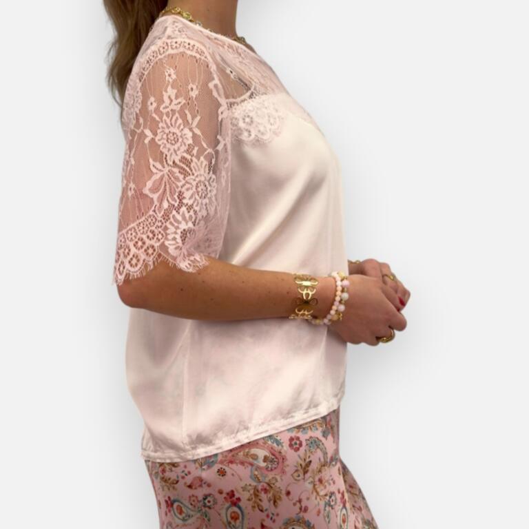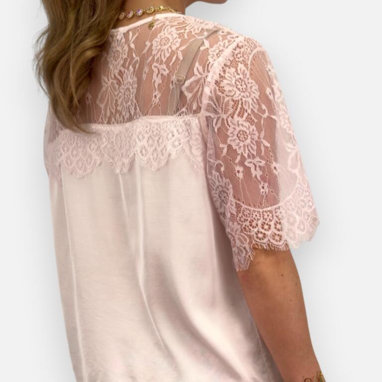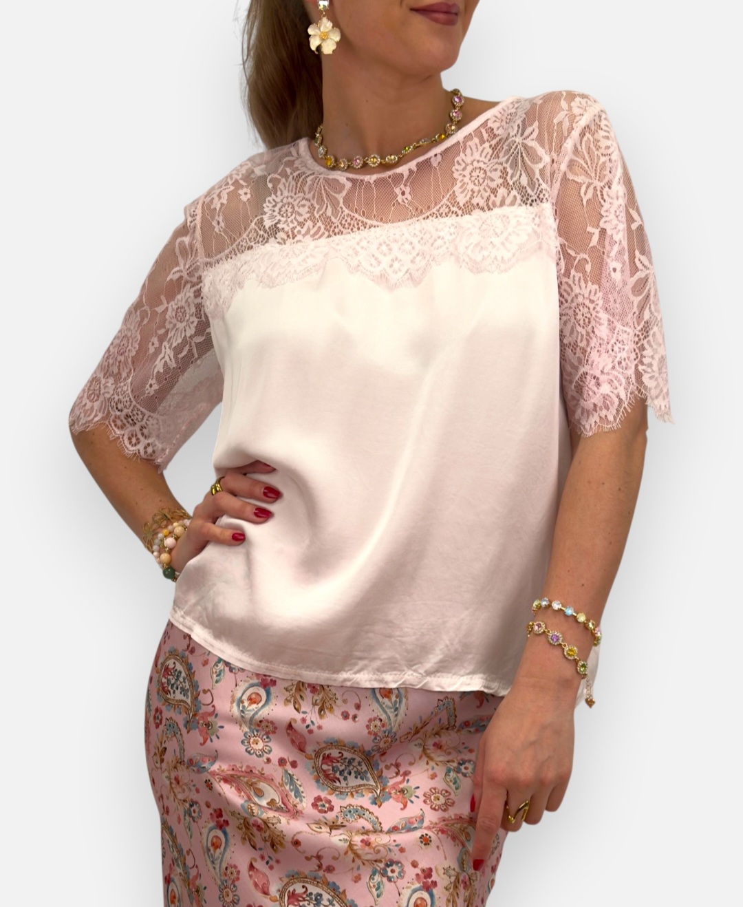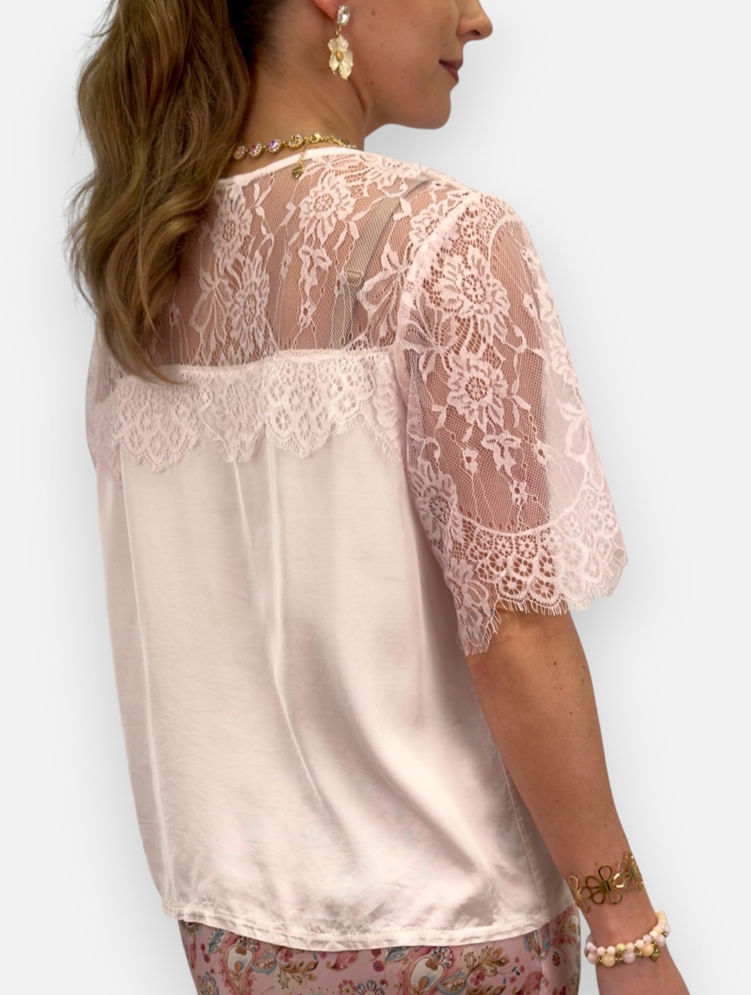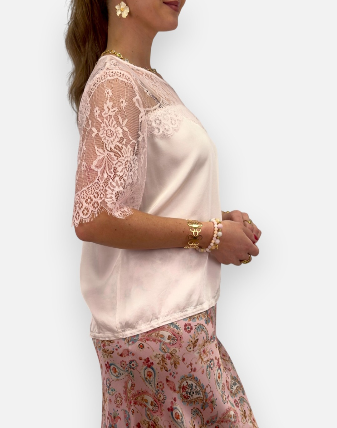 Amalia är en topp med lätt glansig yta och skira spetsdetaljer över axlar och ärmar. Amalia är lika fin till fest som när du bara vill känna dig lite extra speciell en helt vanlig dag.