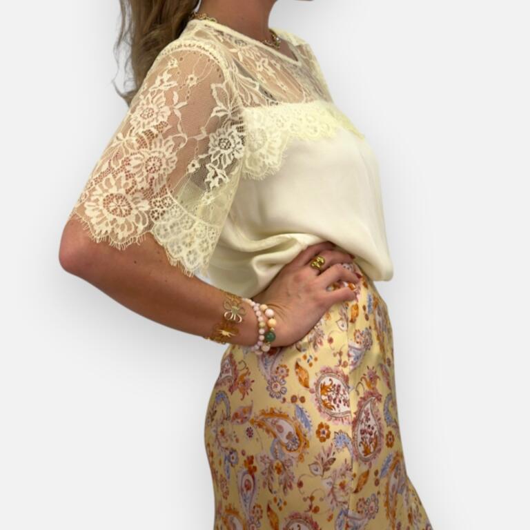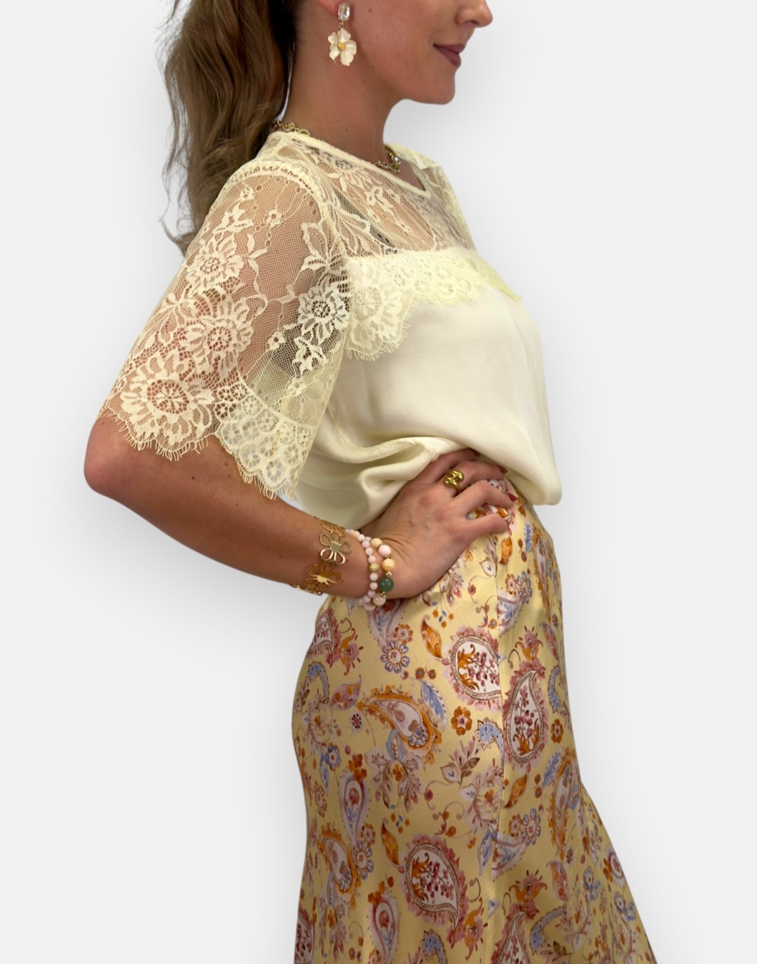 Amalia är en topp med lätt glansig yta och skira spetsdetaljer över axlar och ärmar. Amalia är lika fin till fest som när du bara vill känna dig lite extra speciell en helt vanlig dag.