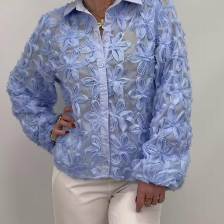 Underblus blus med sydda blommor. Klassisk krage och knappar hela vägen.