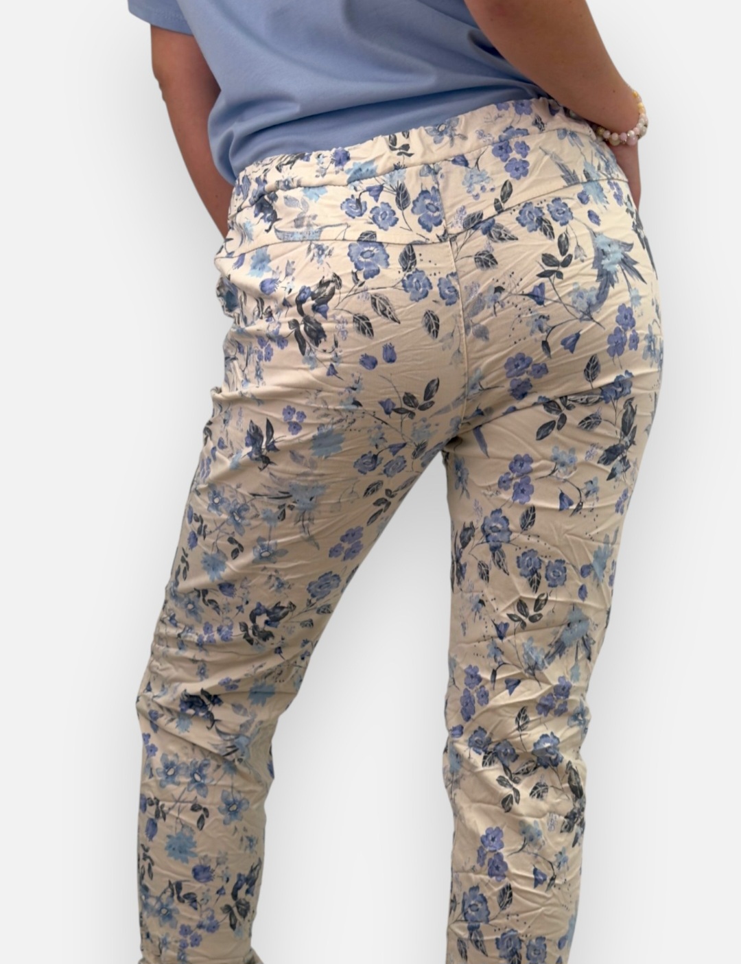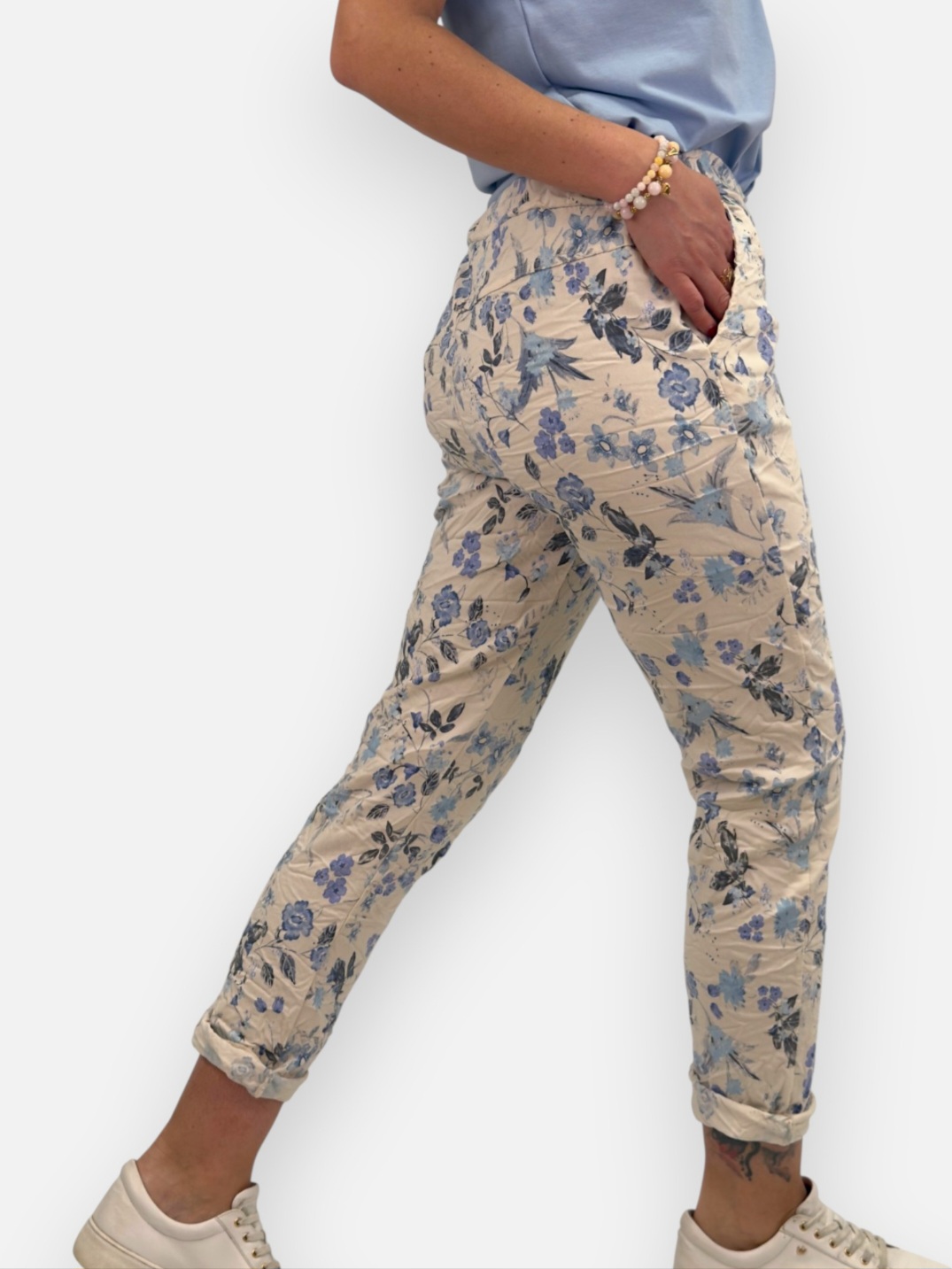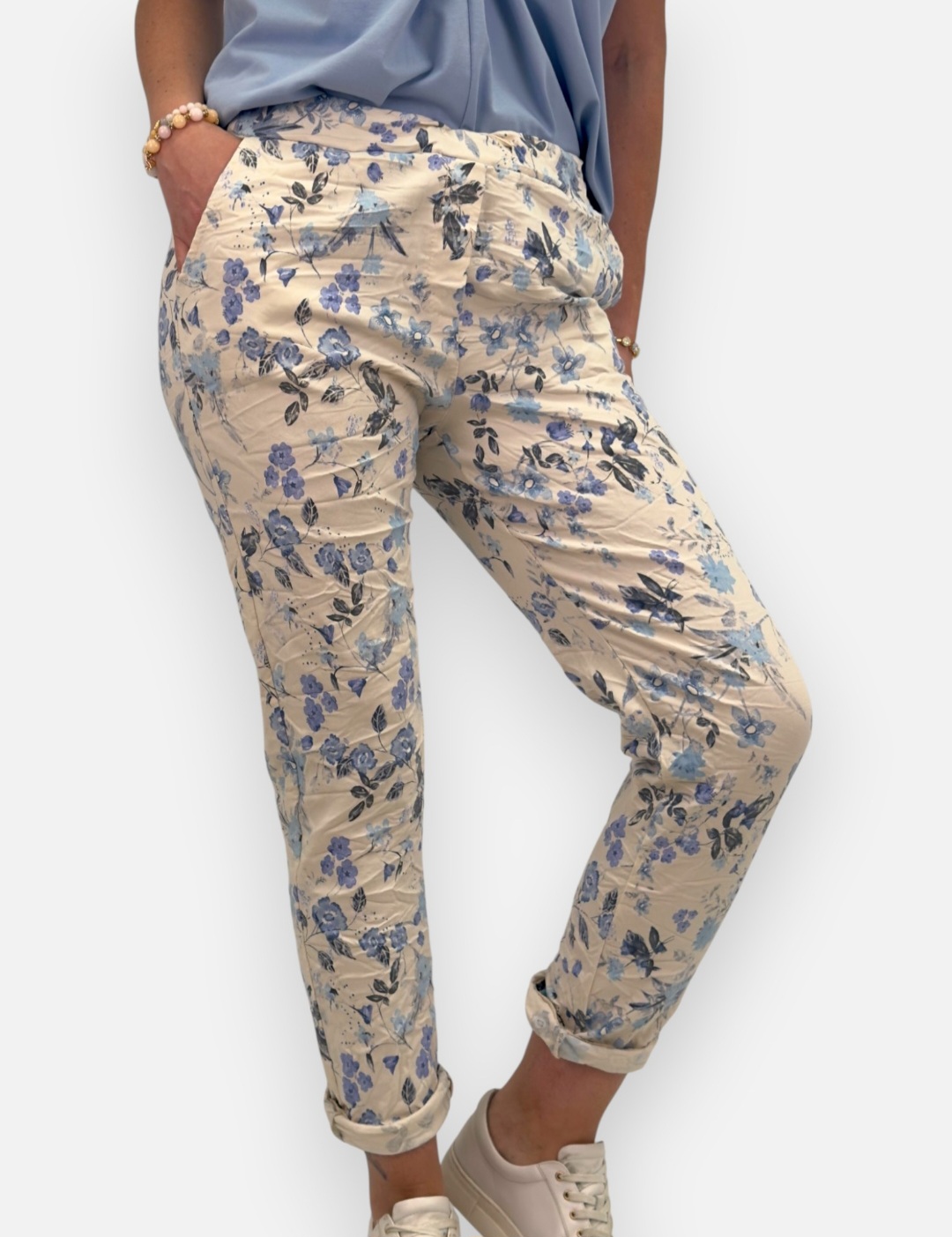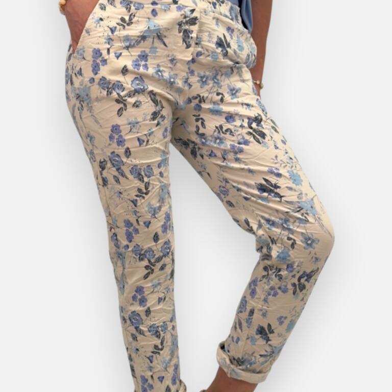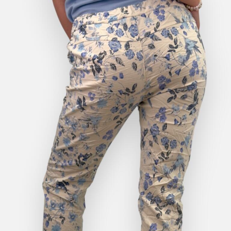 Fiona är de perfekta byxorna för dig som vill ha både komfort och stil. Med stretchig passform och livfullt blommönster blir de snabbt ett favoritplagg i garderoben – lika snygga till en enkel topp som till en dressad blus.