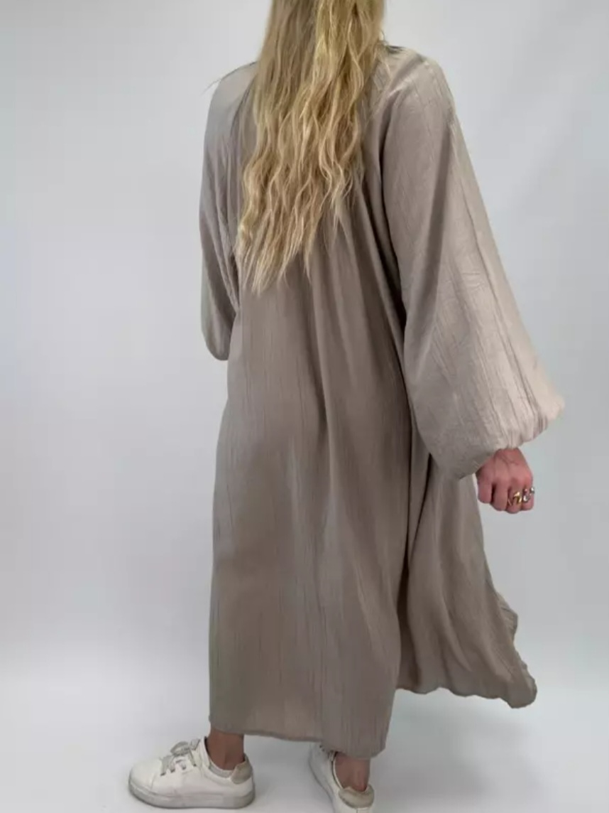 Lucy är en snygg maxiklänning med vacker drapering och struktur i tyget.Den luftiga designen med knappar fram gör den bekväm och lätt att styla. Ballongärm med resår i ärmslut.
