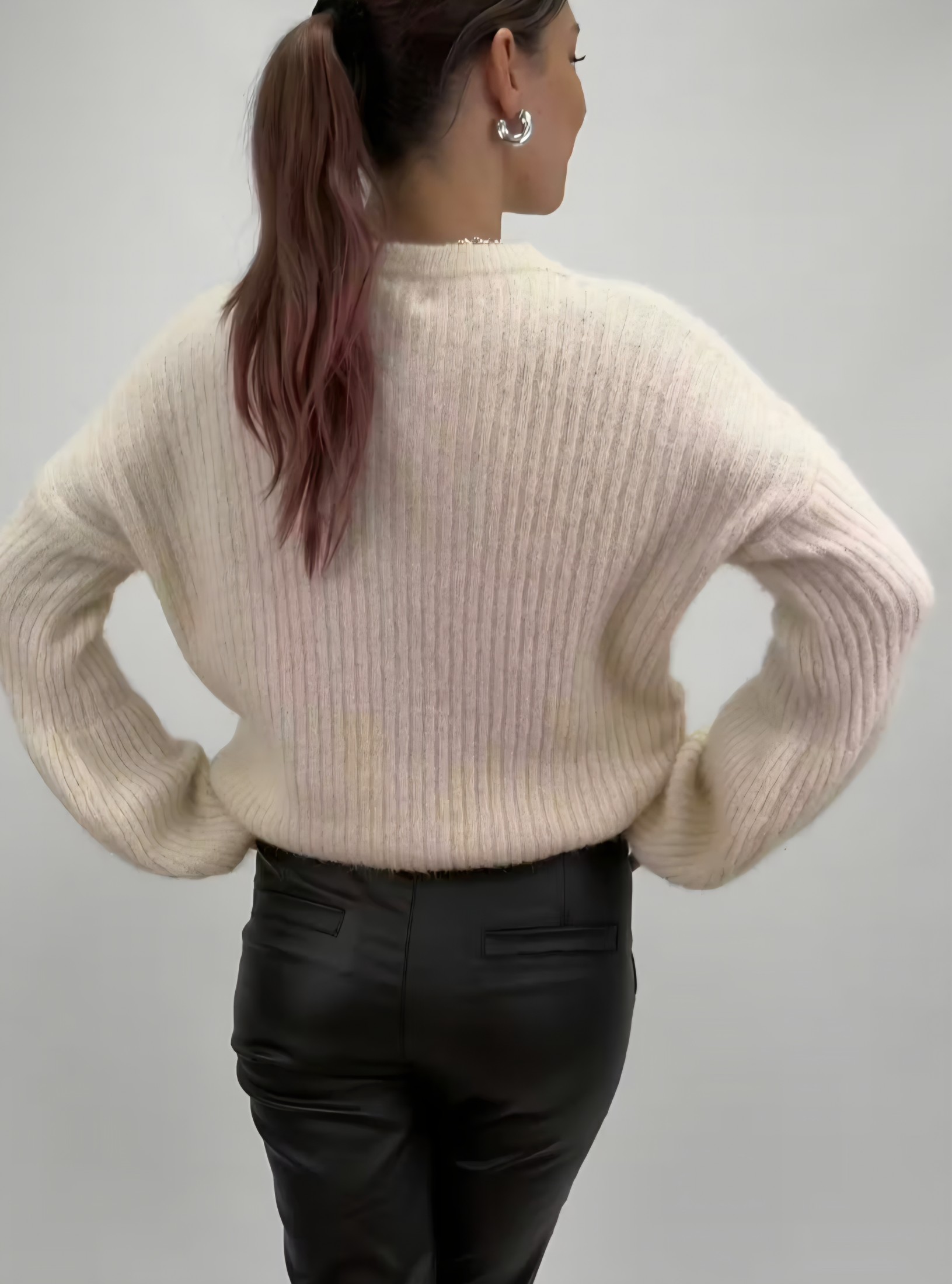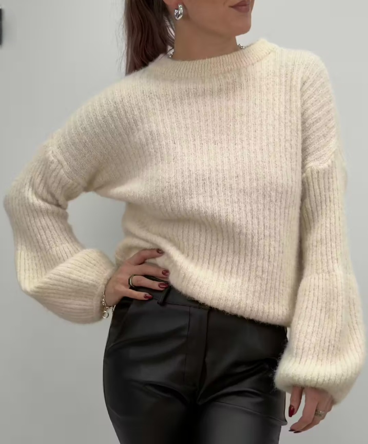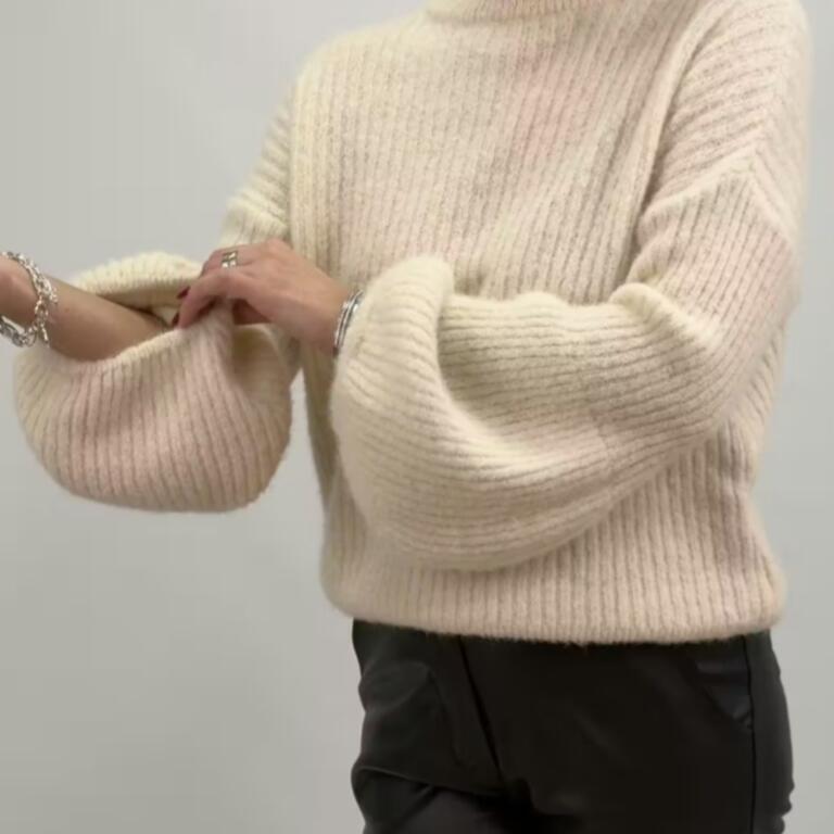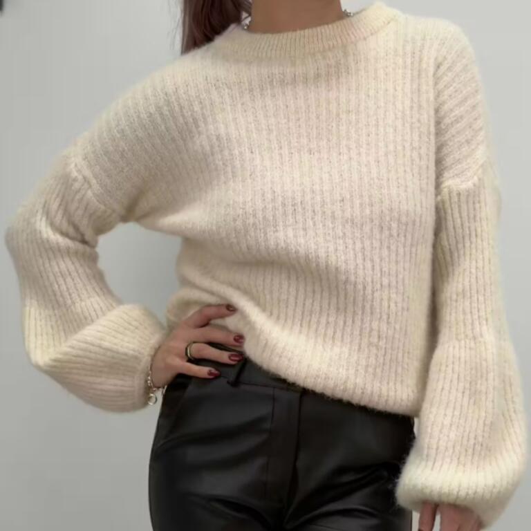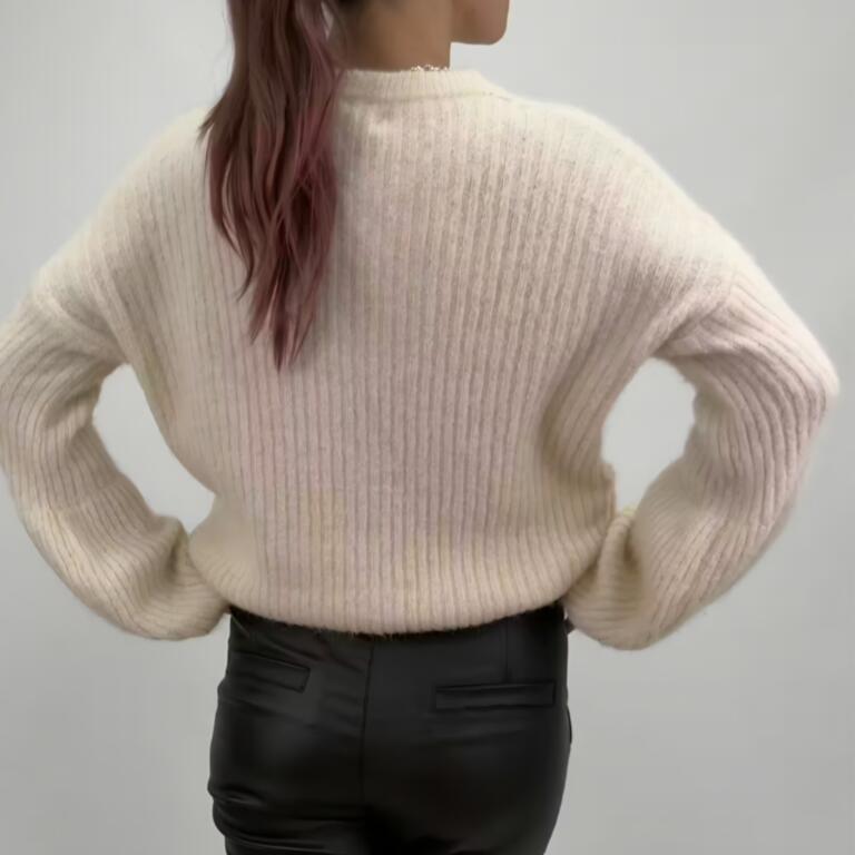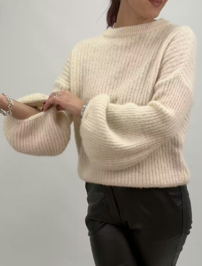Mallan är en stilren stickad tröja med ribbad struktur och lätt ballongformade ärmar. Den klassiska rundhalsen och avslappnade passformen gör den till ett mångsidigt plagg som passar till allt.