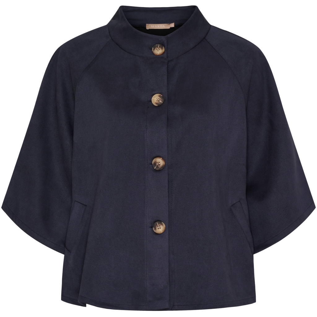 Feminim och elegant jacka i en beige nyans. Rund halsringning, långa raglanärmar och dekorativa knappar framtill samt praktiska fickor. Kan såklart även bäras öppen. Samma material som byxan Annelise.