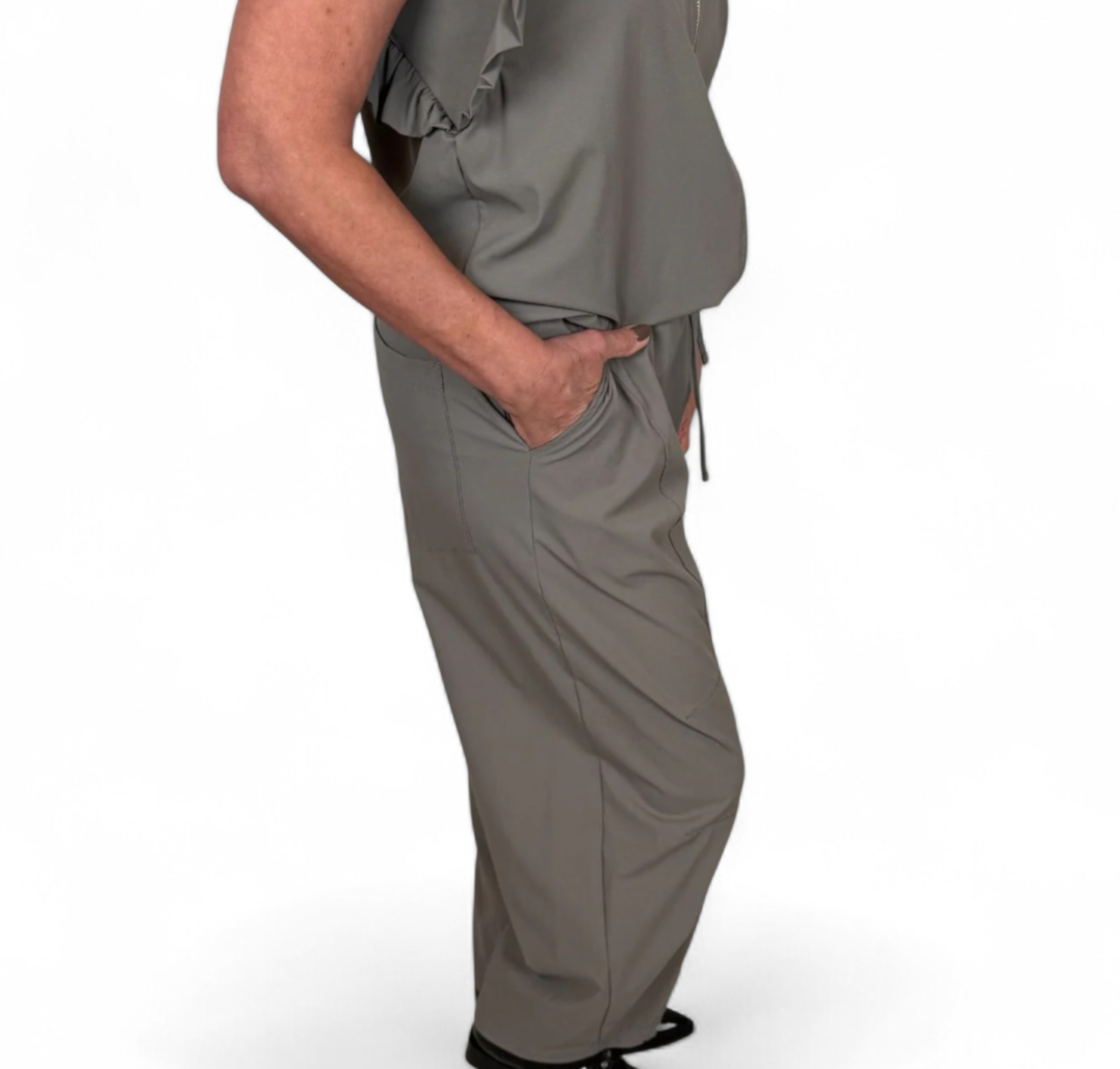 Lätta och bekväma byxor med resår och knytband i midjan. Snedställda framfickor och i en rymlig passform med lätt avsmalnande ben. Passar superfint ihop med Jannie väst.