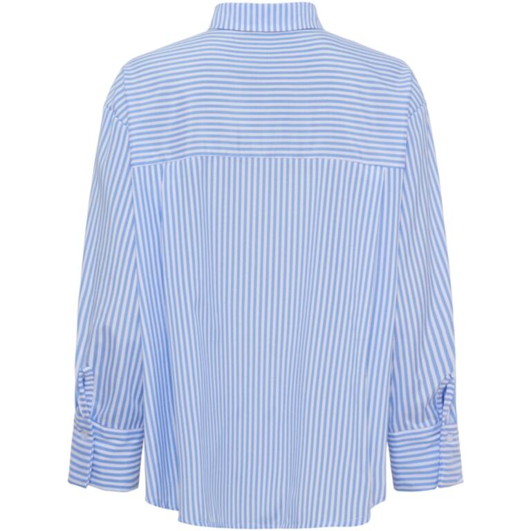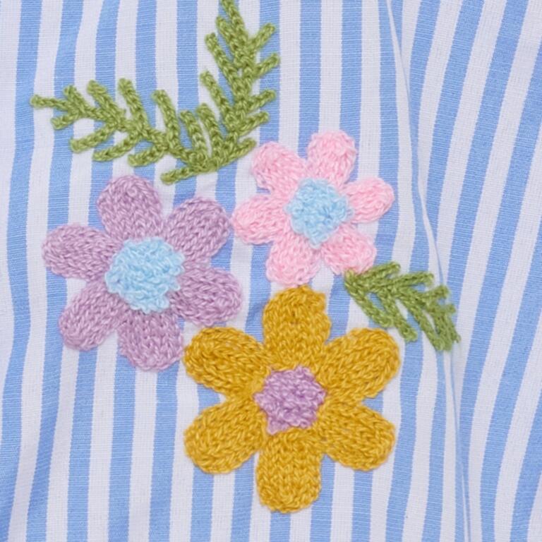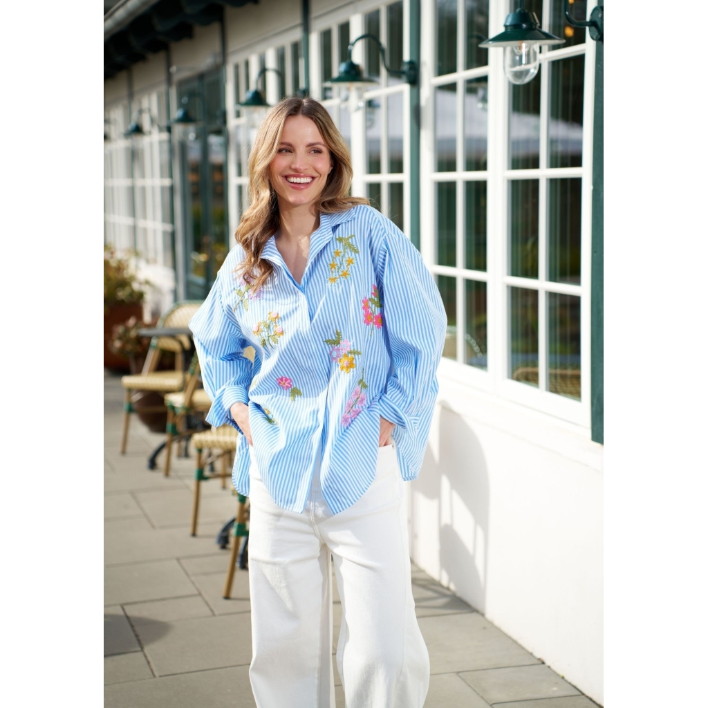 Blåvitrandig skjorta i något längre modell och ledig passform med fina broderade blommor. Helknäppt med dolda knappar och med klassisk skjortkrage