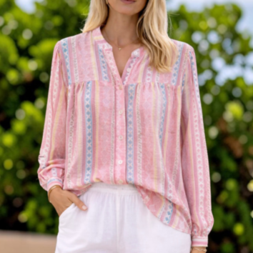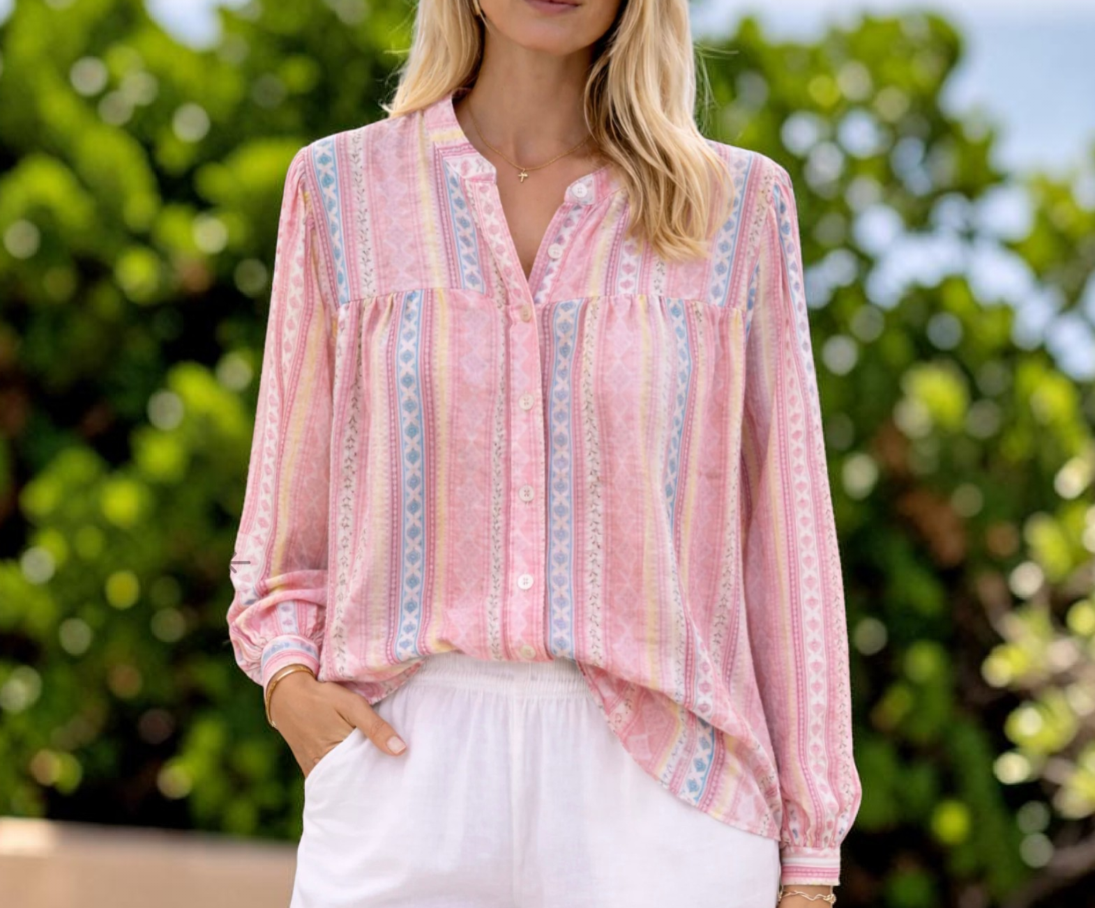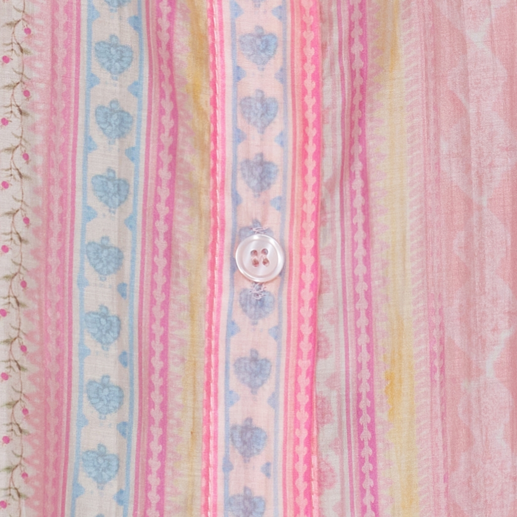 Grafiskt mönster i rosa med pastellinslag, helknäppt
