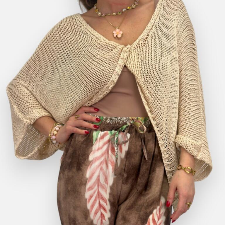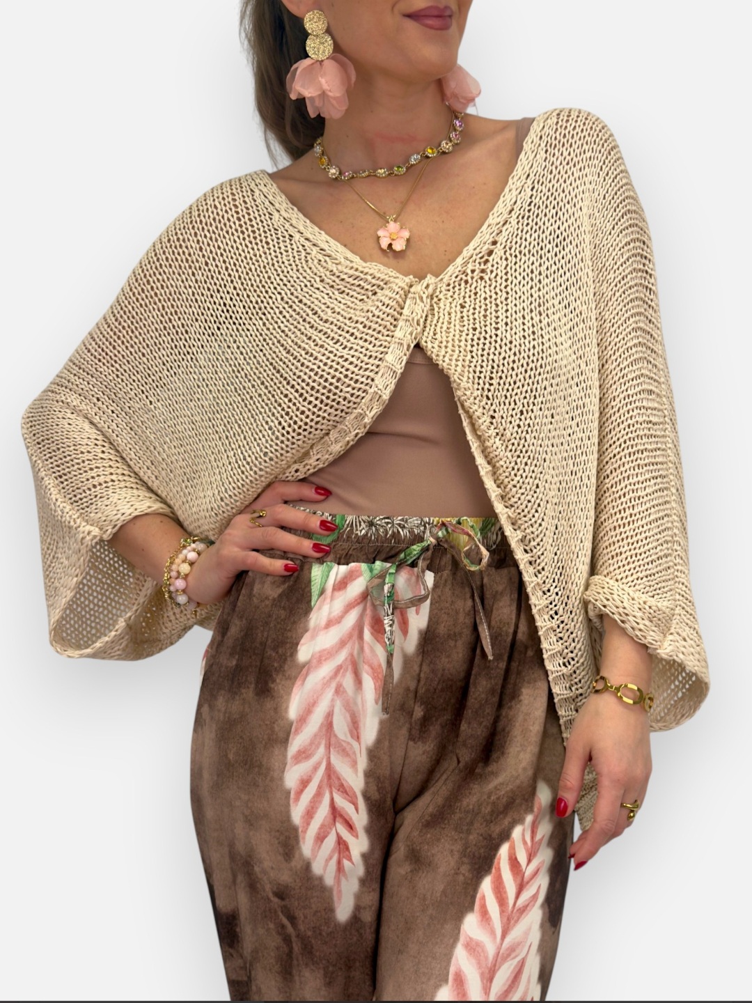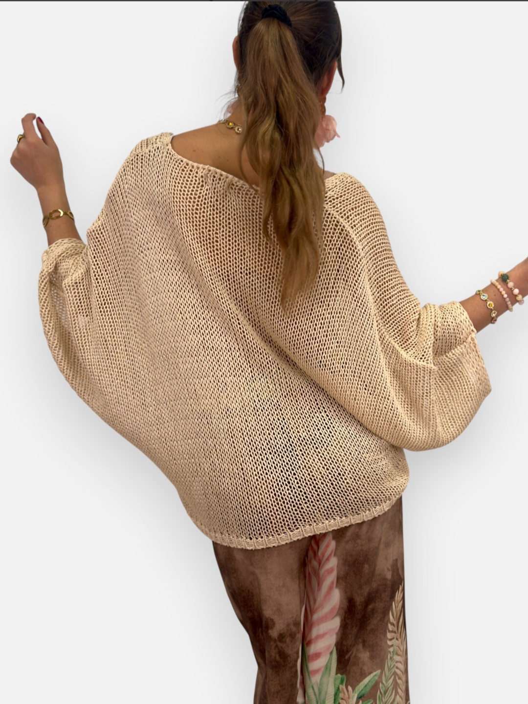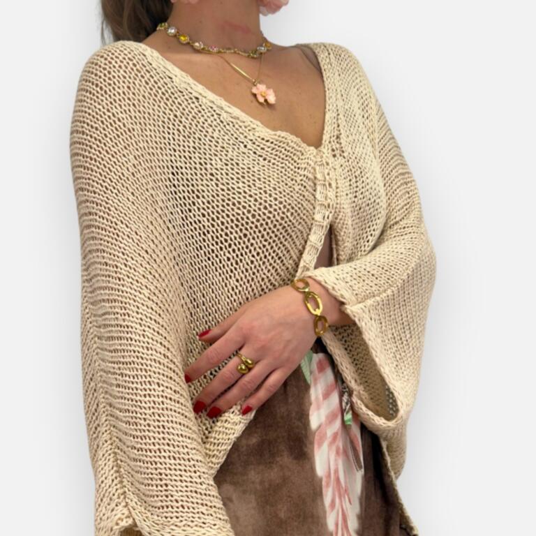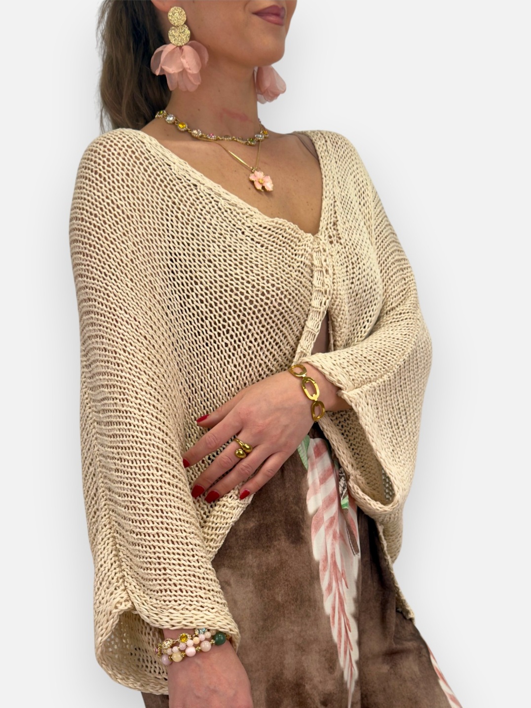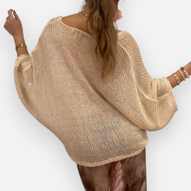 Osha är den glesstickade tröjan som känns som en mjuk sommarbris mot huden. Den luftiga stickningen ger ett avslappnat, bohemiskt uttryck medan knuten framtill skapar en lekfull silhuett med det där lilla extra. Släng den över en topp och låt den falla fritt – det är tröjan som säger “jag är avslappnad” men ändå ser helt magisk ut.