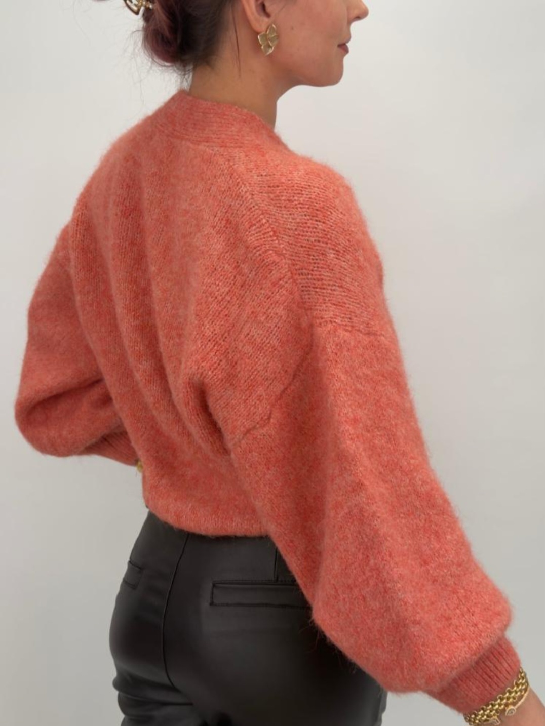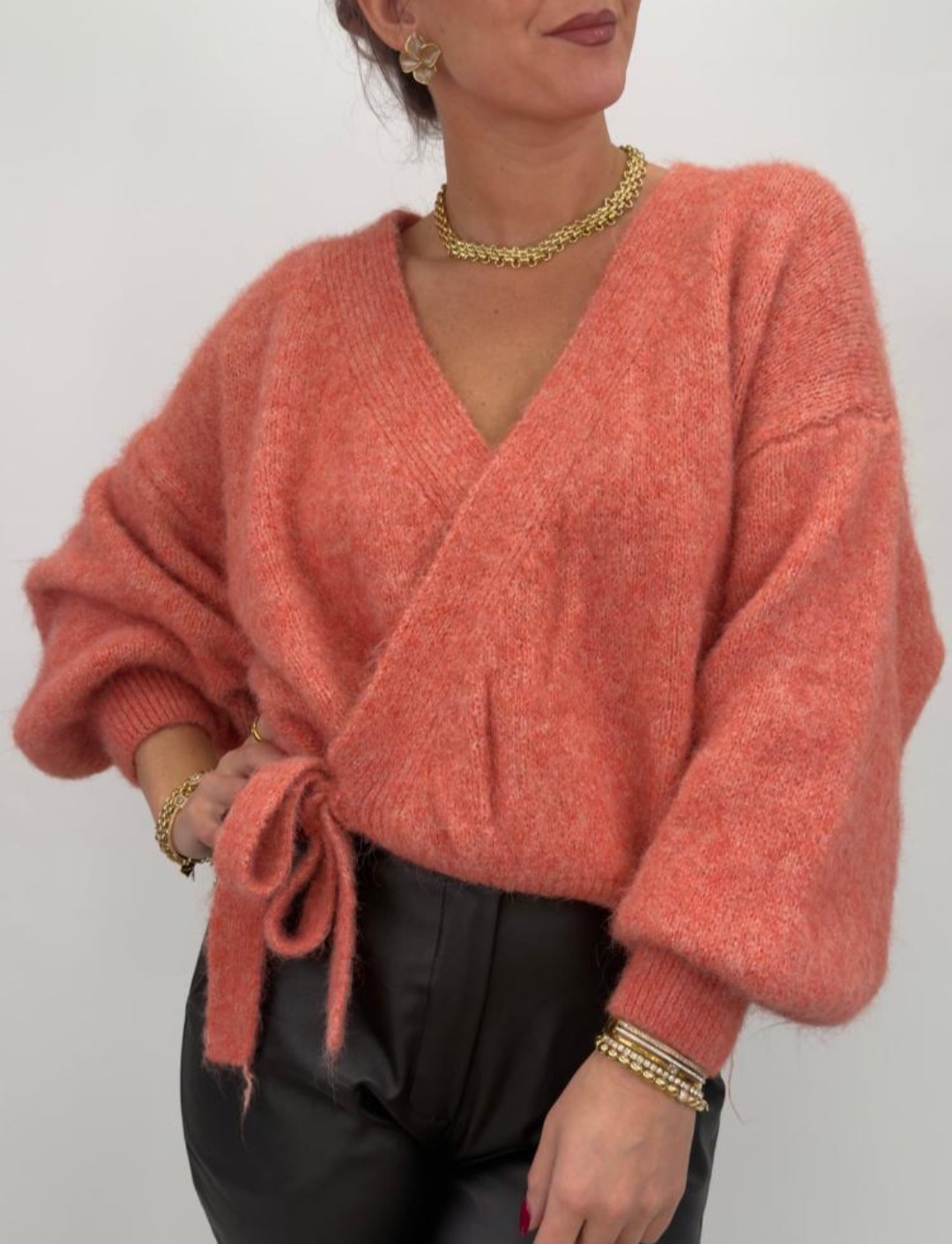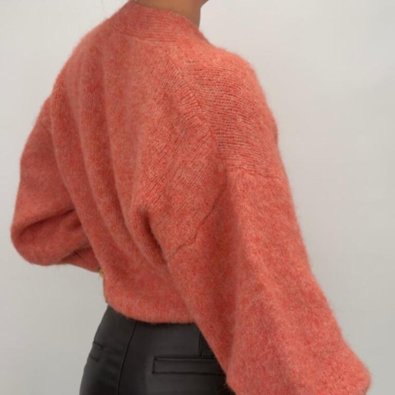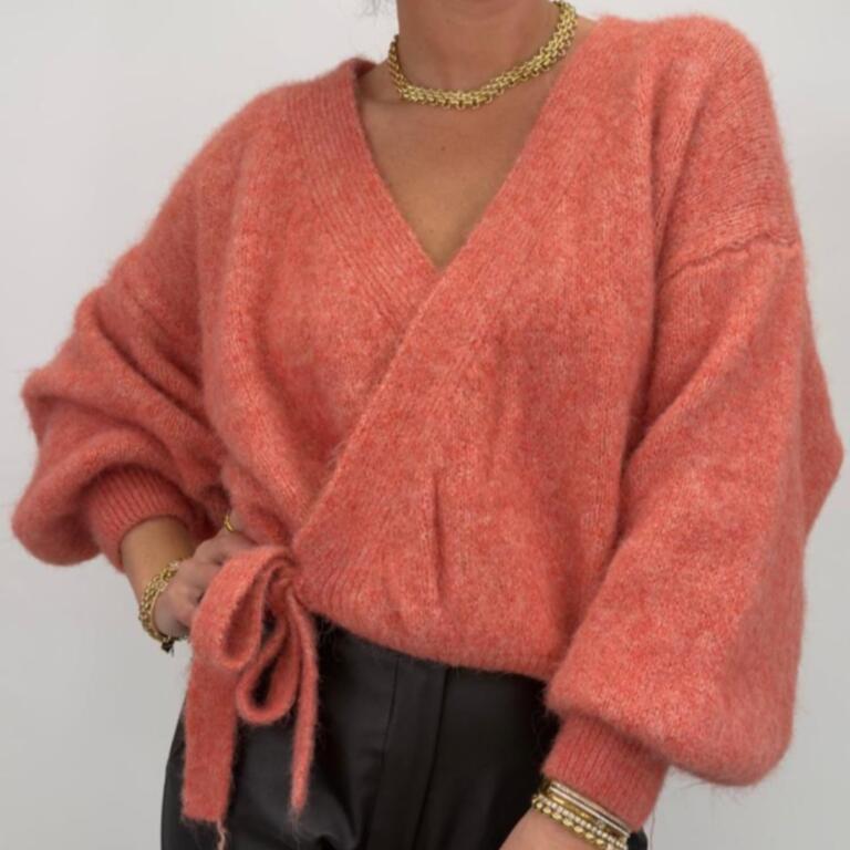 Sol är en härligt mjuk omlottkofta med knyt i sidan och djup v-ringning. Den generösa passformen och puffiga ärmarna ger ett avslappnat men elegant uttryck – perfekt att bära över en topp, klänning eller som den är.