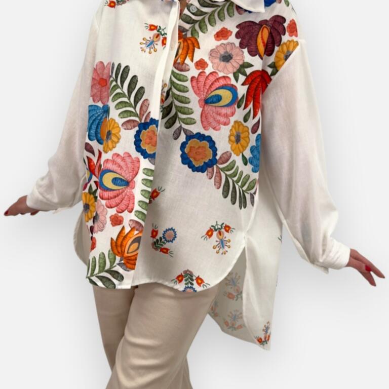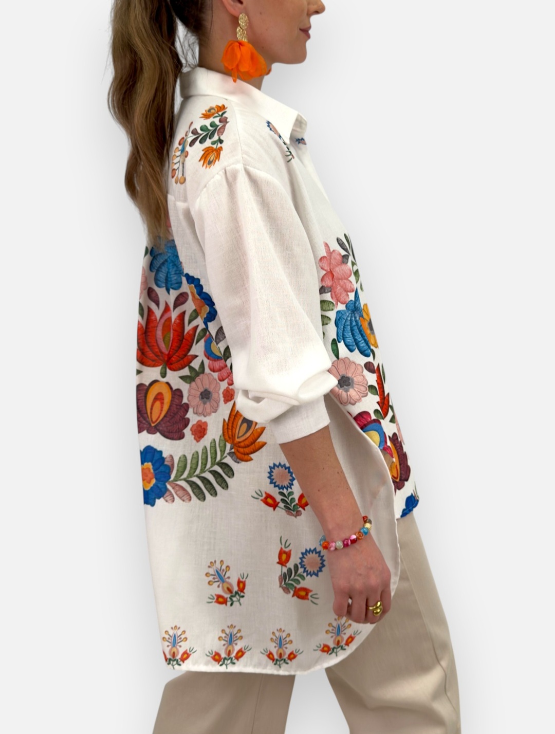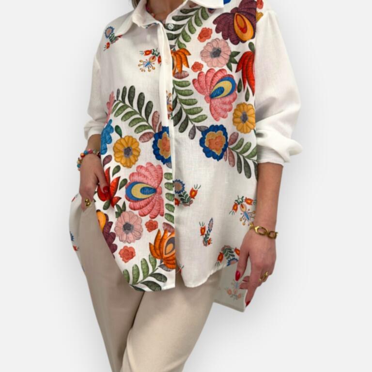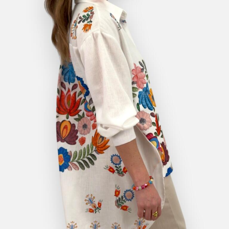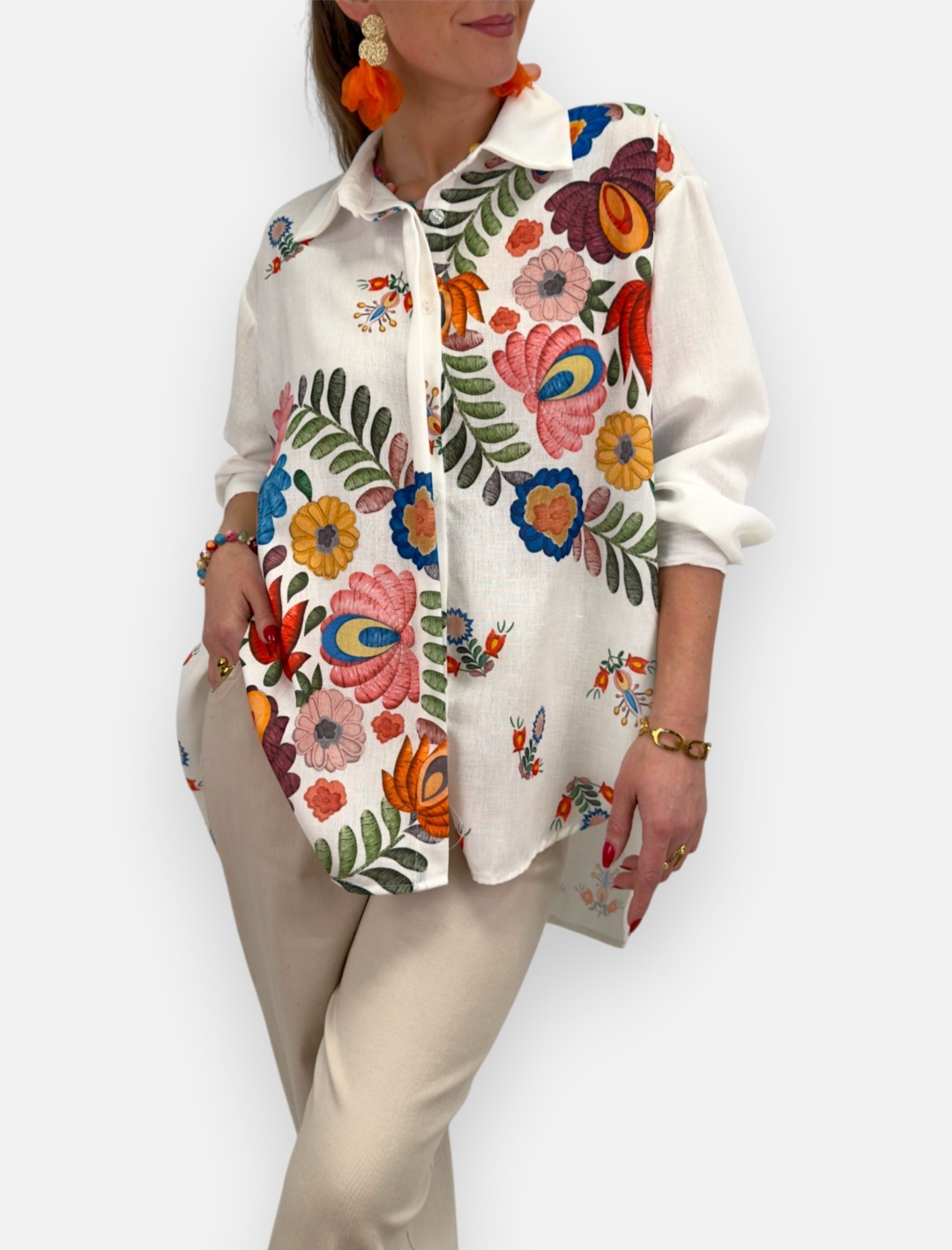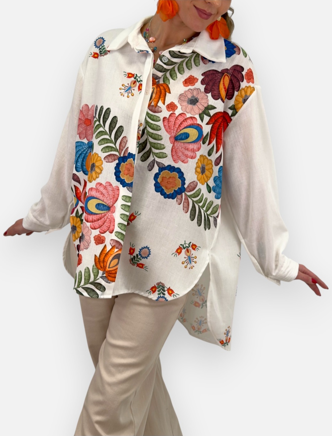 En oversized skjorta med generös passform i underbart färglatt tryck. Bär den öppen eller knäppt.