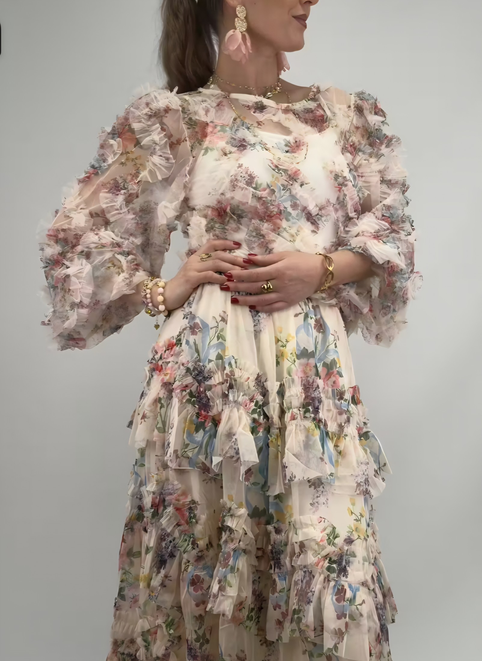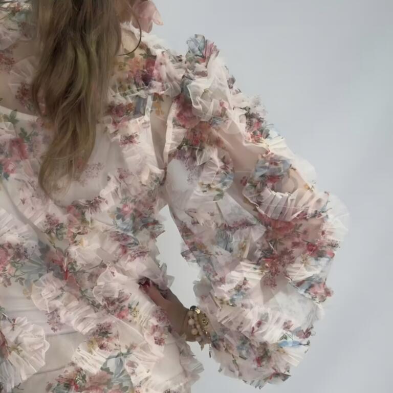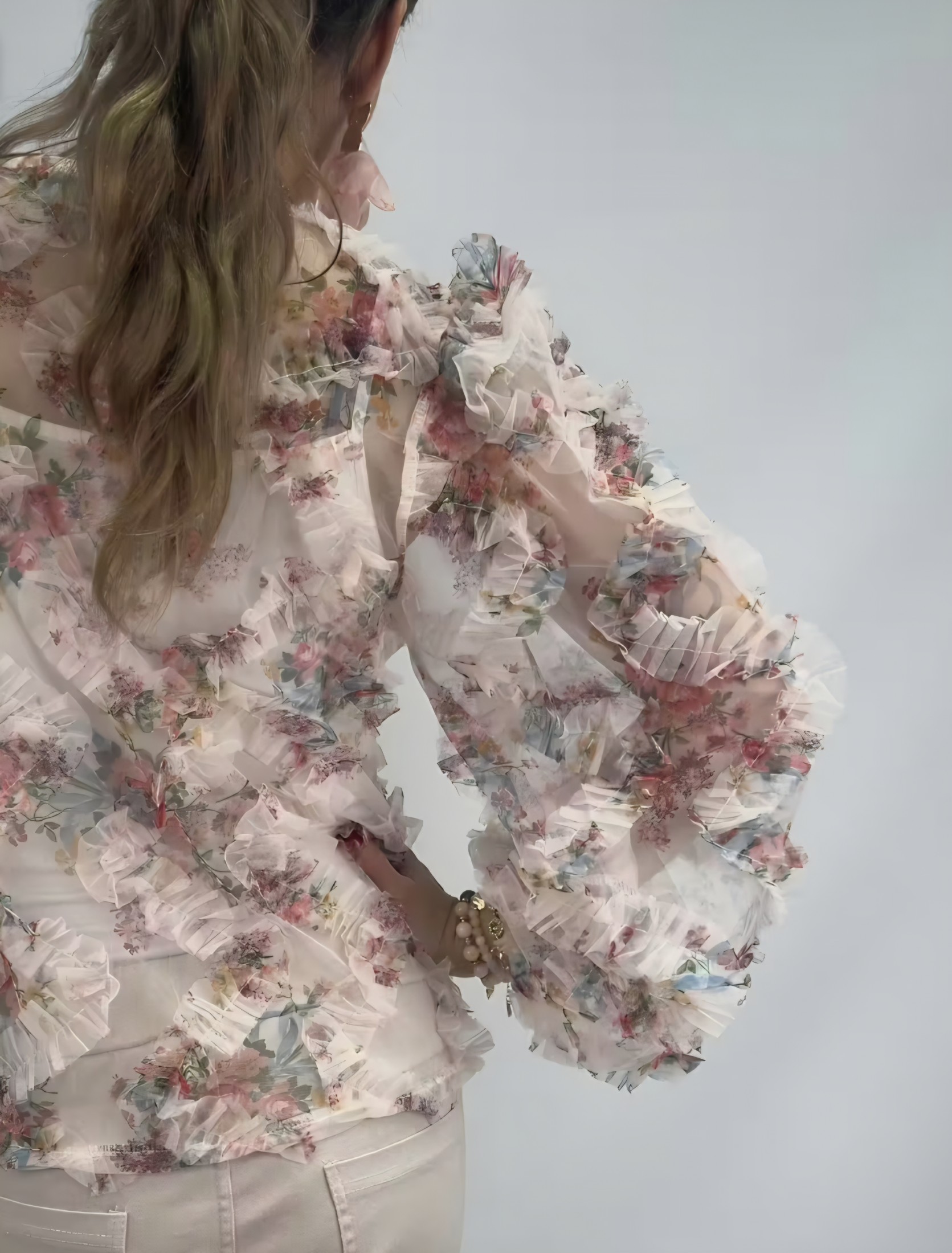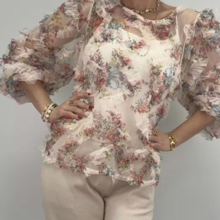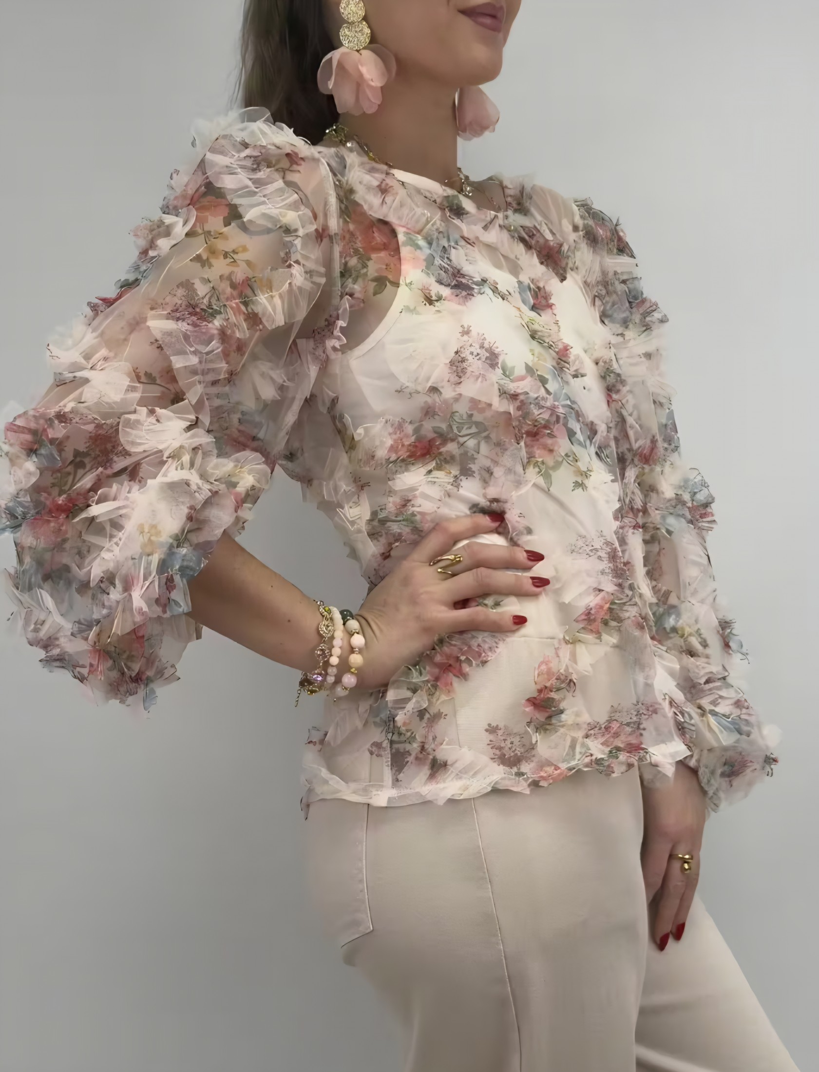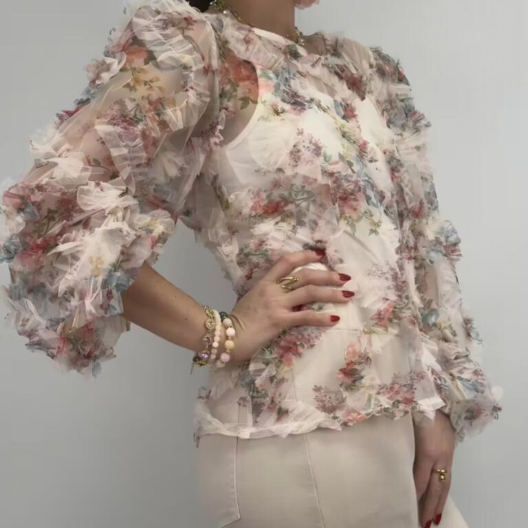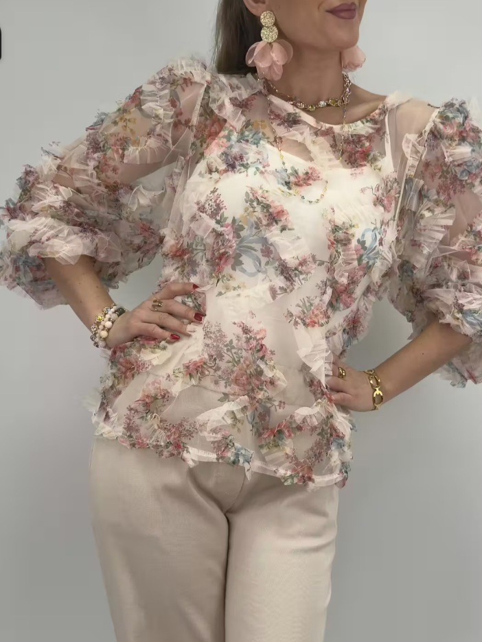 Sari är en blus som får dig att känna dig både romantisk och självsäker. Den blommiga designen i luftig tyll skapar ett mjukt, drömmigt uttryck, och det tillhörande underlinnet gör den lika bekväm som elegant. Perfekt när du vill klä upp vardagen eller glänsa lite extra vid speciella tillfällen.