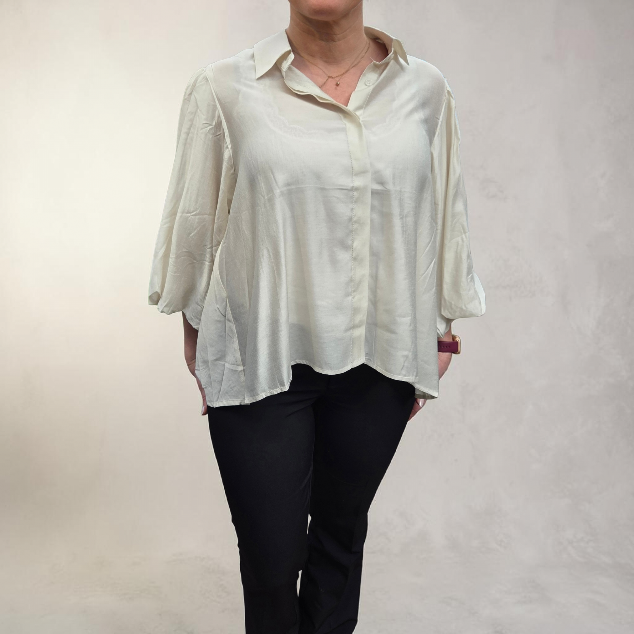 En superluftig och härlig skjortblus med ballongärmar. Blusen är längre baktill. Knappar.