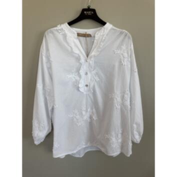 Feminin blus med fina broderade detaljer och en lätt textur i tyget. Rund halsringning med knappknäppning och små volanger framtill, samt ärmar med resår.